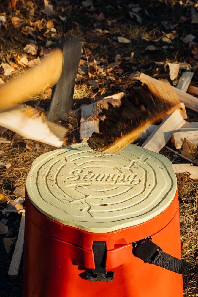 Stumpy is a one-of-a-kind product born from an idea sparked during a camping trip in the Canadian Rockies. On a quest to start a fire, we found ourselves scrambling to chop smaller pieces of wood, but couldn't find a safe, suitable surface to work on. Instead of using uneven tree roots or gravel pads, we thought, "There has to be a better, safer solution!"
